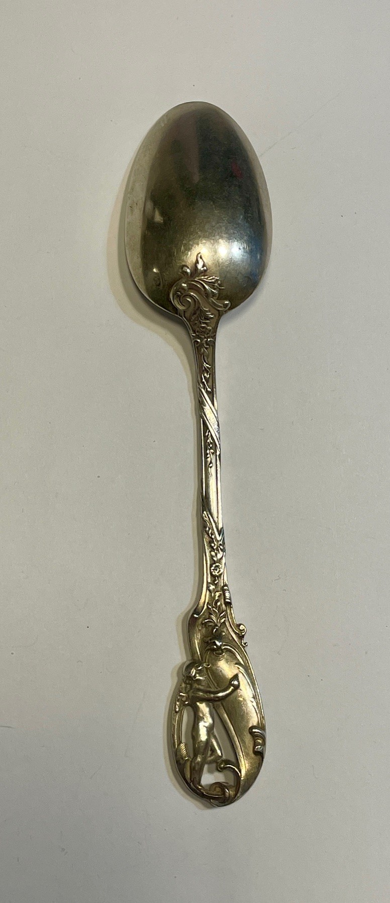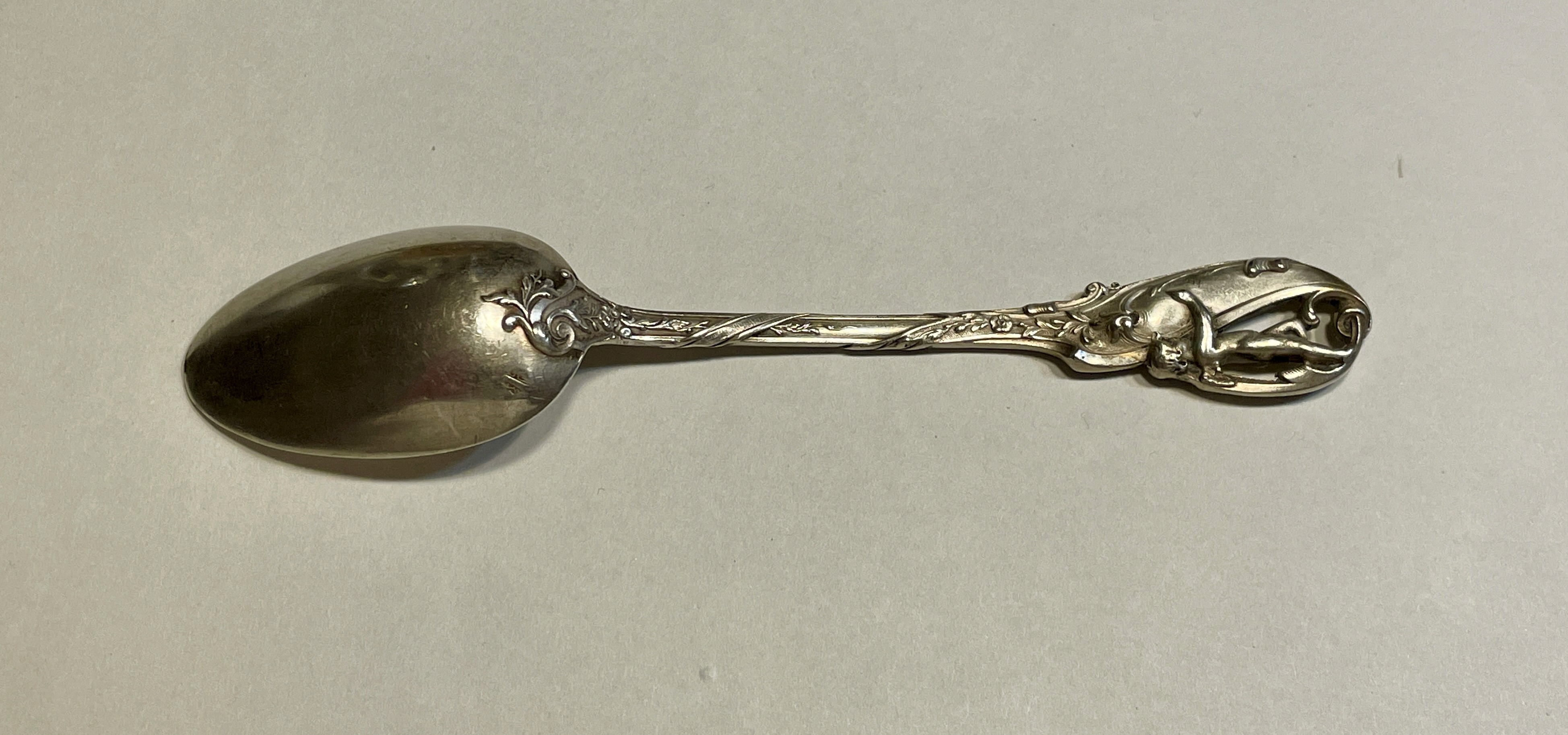 Lžička ze stříbra ryzosti 950/1000, se secesním figurálním motivem, délka 13 cm, hmotnost 21.7 g.